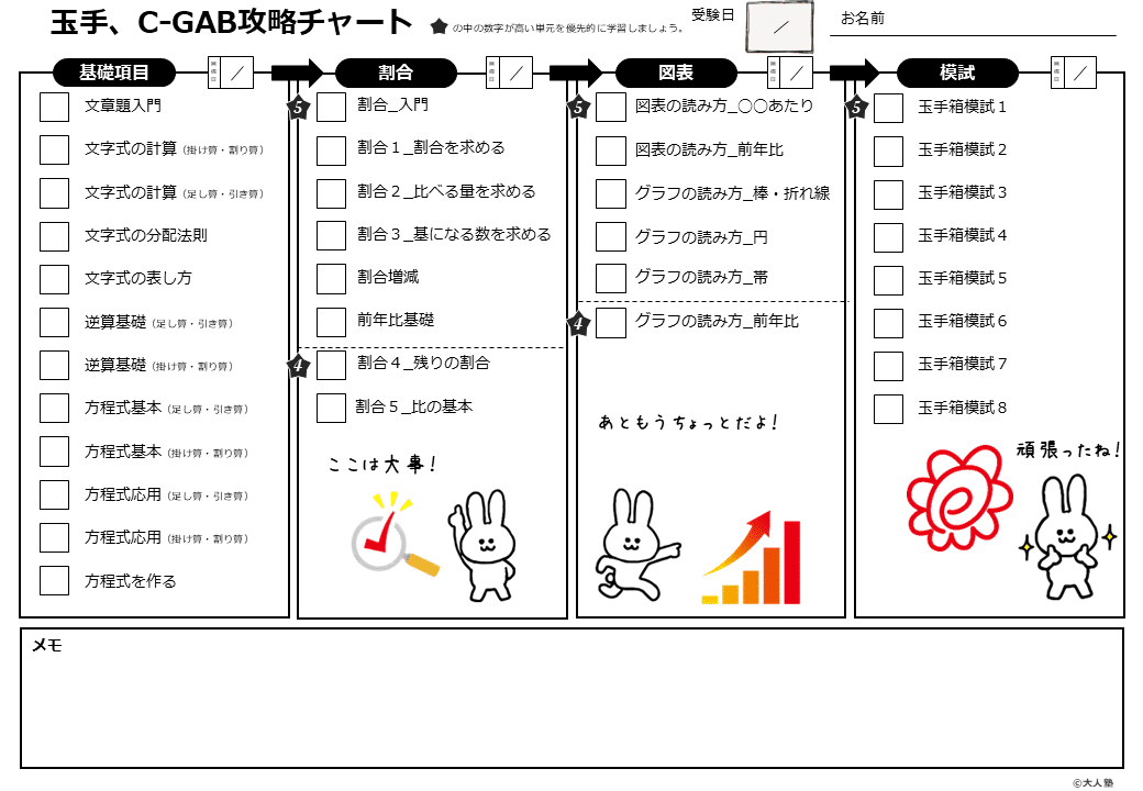 一通り学習項目を学習したら、模擬試験に入ります。最初は時間制限のない模試で、さまざまな問題タイプを思い出します。次に、時間制限のある模試で、時間内に問題を解く練習をします。解ける問題、捨てる問題の見極めも練習します。